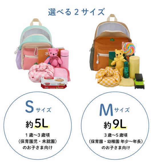 Sサイズは背面に、Mサイズは背面とショルダー裏に通気性の高いメッシュ素材を採用しており、肌に触れる部分の蒸れを軽減します。また、両サイズ共通の機能として、突然の雨でも安心の撥水加工や、元気に動いても安定感を保つチェストベルトを装備しています。さらに、Sサイズはフロント部分にお子さまの迷子を防ぐ専用ベルトを、Mサイズはショルダー部分に暗い場所でも視認しやすいリフレクターを搭載するなど、成長段階に合わせた安全機能を備えています。