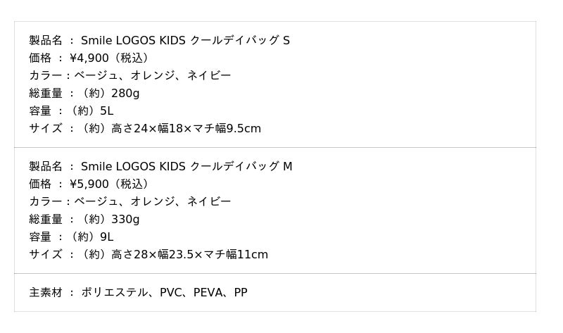 【 Smile LOGOS KIDS クールデイバッグ M 】https://www.logos.ne.jp/products/info/11731