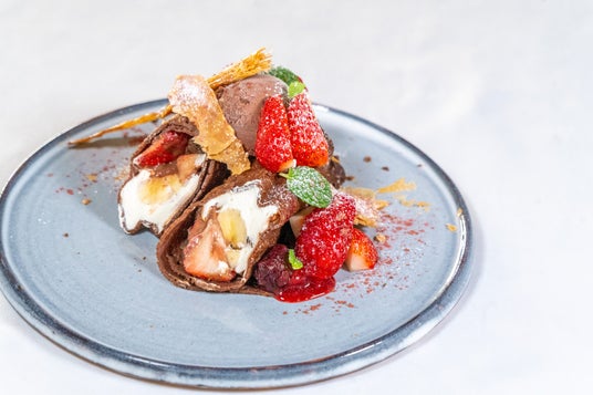 もっちりと焼き上げたクレープ生地に、甘酸っぱい苺とやさしい甘さのバナナをたっぷり包み込み、チョコレートソースで仕上げました。