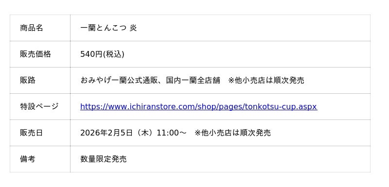 株式会社一蘭は、2026年2月5日(木)11時より、「一蘭とんこつ 炎」を、おみやげ一蘭公式通販および全国の一蘭店舗にて再発売いたします。(※他小売店では順次発売予定です)