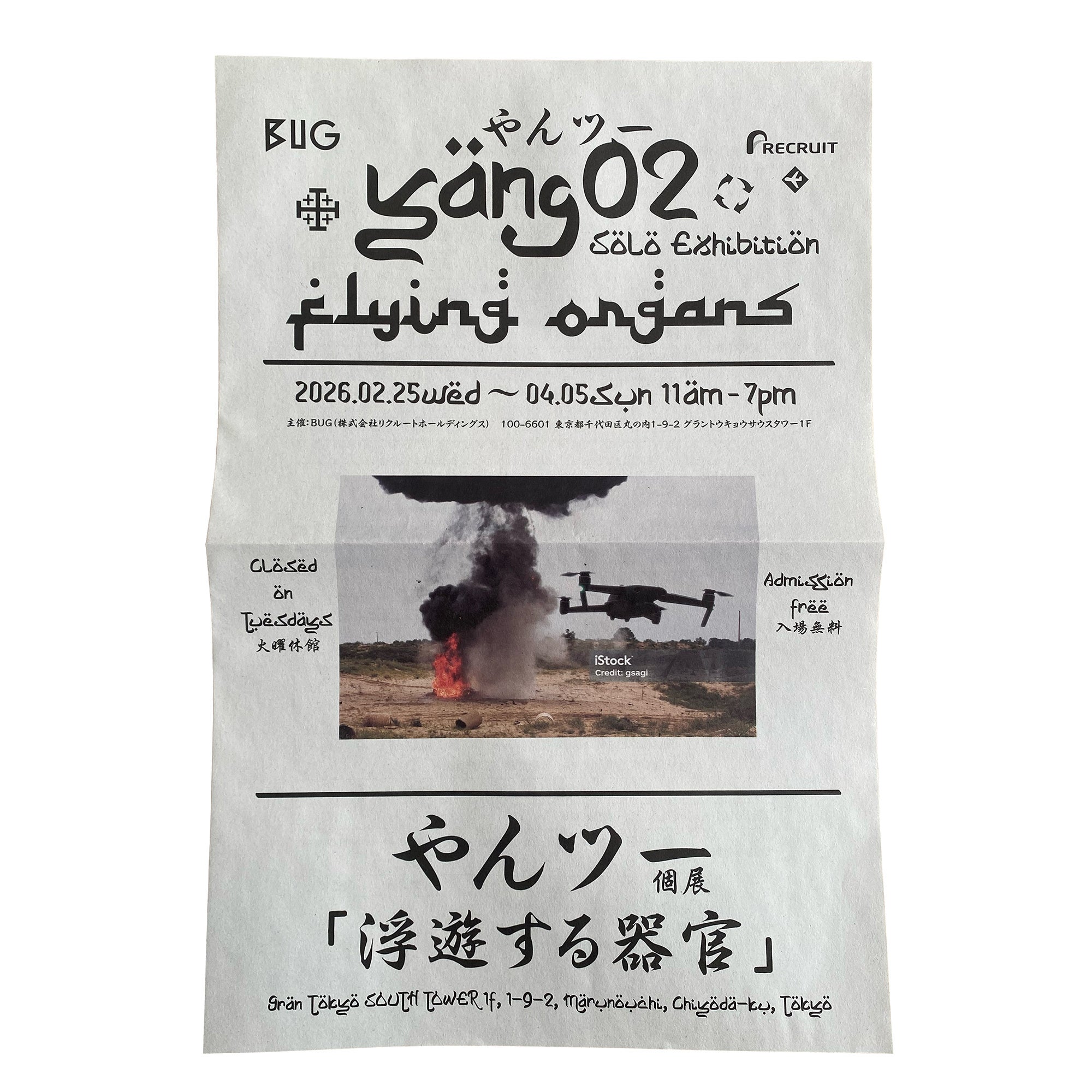 株式会社リクルートホールディングスが運営するBUGでは、2026年2月25日(水)より、やんツー個展「浮遊する器官」を開催します。やんツーはこれまで、AIやセグウェイといったテクノロジーを用いた作品を発表しながら、進歩主義や資本主義に対して批判的なまなざしを投げかけてきました。また、これらテクノロジーに関わる人間の身体性や主体性を捉え直すことも試みています。本展では、AIを搭載したドローンとカタパルト(投石器)が言葉を交わし、その対話の内容に呼応して動作する演劇形式の新作を発表します。