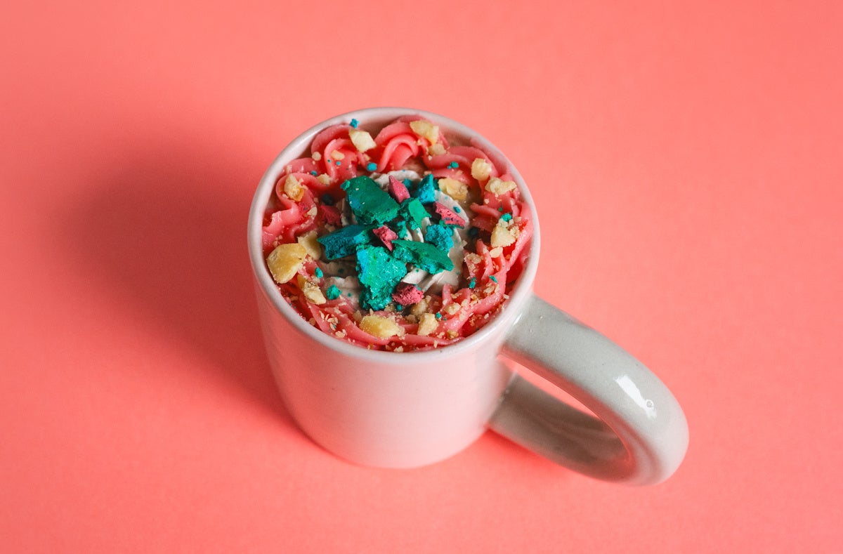 会期中、併設のBUG Cafeにて展覧会コラボレーションメニューを提供します。ウクライナの伝統的なケーキである「キーウケーキ」をイメージしたドリンク。材料の組み合わせや色とりどりの見た目が特徴的なケーキです。