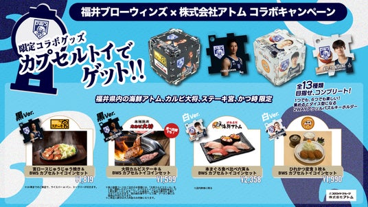 株式会社アトムは株式会社福井ブローウィンズとのコラボ企画として、対象商品とオリジナルカプセルトイが回せるコインのセットメニューを販売いたします。