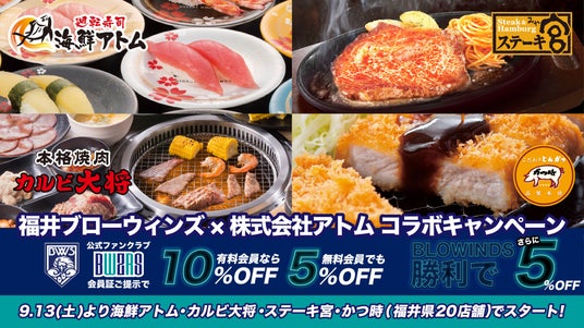 コロワイドグループの株式会社アトム(本社:神奈川県横浜市、代表取締役社長:植田剛史)では、福井県内のアトム運営全20店舗限定で福井ブローウィンズとのコラボ企画を実施いたします。