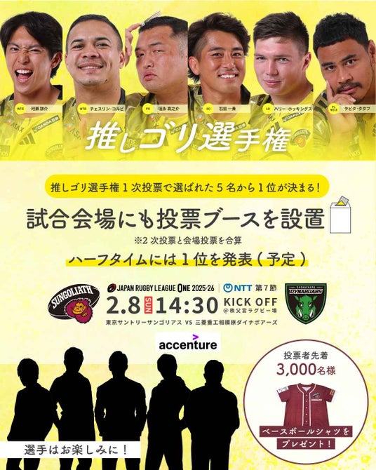 東京サントリーサンゴリアスは、2026年2月8日(日)開催のホストゲーム「NTT JAPAN RUGBY LEAGUE ONE 2025-26 第7節 三菱重工相模原ダイナボアーズ戦」を、アクセンチュア株式会社をマッチデーパートナーに迎え、『アクセンチュア マッチデー』として実施いたします。