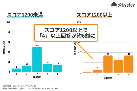 その結果、「Stockr」アプリの起動や記録、過去の記録の振り返りによって蓄積されるスコアが1200以上のユーザーの約6割が、5段階評価において「4」以上と回答し、成長実感を得ていることが明らかになりました。また、スコア1200に到達時点での行動量の中央値は、記録95件・振り返り25件で、到達期間の中央値は10.2ヶ月であることが分かりました。