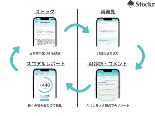 日々の思考や感情を記録する「ストック機能」、過去の記録から気づきを得る「再発見機能」、AIがサポートする「ビジョン設定コーチング」「AIコメント」「価値観診断」、日々の積み重ねを可視化する「スコア&レポート機能」を提供しています。
