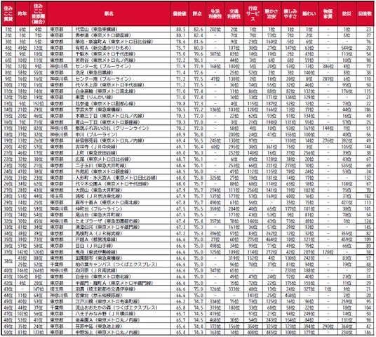 ●トップ2の駅は偏差値80台の極めて高い評価、3位~17位までの駅は偏差値70台の高い評価を得ています。また、18~50位の駅は偏差値60台で相対的に住みここちが良いという評価になっています。