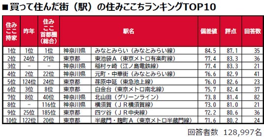 1位は5年連続で神奈川県横浜市西区に位置するみなとみらいで、唯一偏差値80台の極めて高い評価を得ており、「住みここち<首都圏版>」でも1位です。2位は東池袋A(近接駅の東池袋四丁目・東池袋・都電雑司ヶ谷を統合)で、昨年24位から順位を上げました。3位は神奈川県鎌倉市に位置する稲村ヶ崎で、昨年は累計回答者数が20名未満でランキングの集計対象外でした。