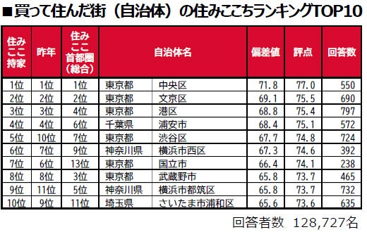 ■「買って住んだ街(自治体)の住みここち」トップは、5年連続で東京都中央区