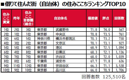 1位は、昨年2位から順位を上げた東京都武蔵野市です。2位は東京都中央区、3位は昨年6位から順位を上げた神奈川県横浜市都筑区です。トップ10のうち、8つが東京都の自治体という結果になっています。