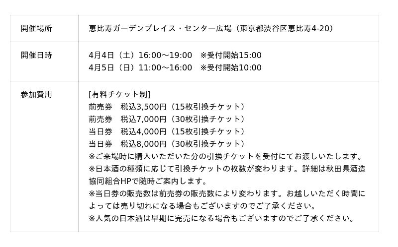 秋田の酒を楽しむ会in東京(秋田県酒造協同組合主催)2026年4月4日(土)、5日(日)に恵比寿ガーデンプレイスセンター広場で開催決定