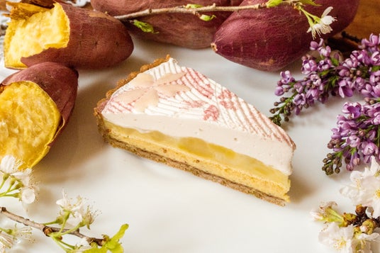 胡麻を加えたプチプチとした食感のタルトに、香ばしい白ごまのクレームブリュレを流し焼き上げました。さつまいものミルク煮をたっぷりとのせ、仕上げに春の桜をイメージしたまろやかなクリームをあわせました。