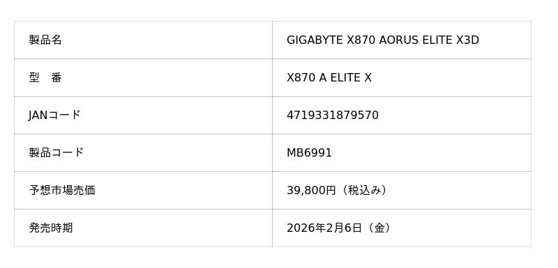 株式会社ニューエックス(本社:東京都千代田区)は、取り扱いメーカーであるGIGABYTEより、AMD X870 チップセットを搭載した ドスパラ 限定モデル ATX マザーボードの「GIGABYTE X870 AORUS ELITE X3D」を2026年2月6日(金)に発売いたします。