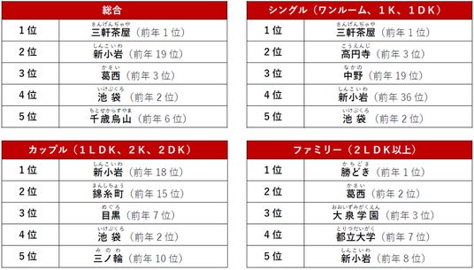 ■東京23区でPV数が多い駅 総合1位 「三軒茶屋」駅総合1位は前年に引き続き「三軒茶屋」駅でした。特にシングルタイプでのニーズが強いです。また、総合2位の「新小岩」駅は前年19位からの大幅ランクアップ。南口の再開発でさらなる生活利便性の向上が期待されています。