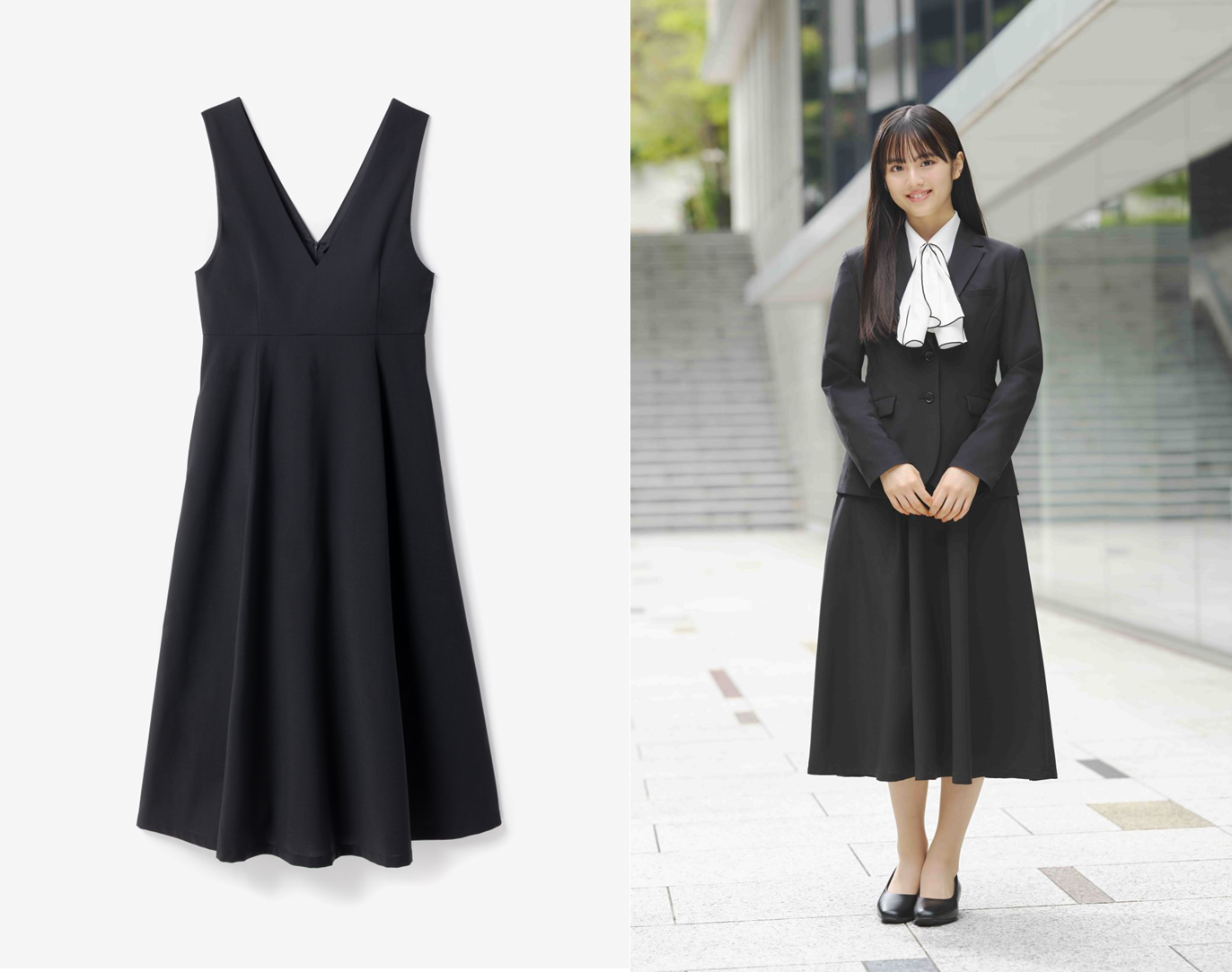 ブラックスーツのジャケットやボトムと同じ生地を採用し、ジャケットを羽織ればきちんとしたシーンでもしっかり見えて上品な印象が演出できます。パンツスーツやスカートスーツにプラスして新たに加わった、新しいブラックスーツのスタイルは必見です。