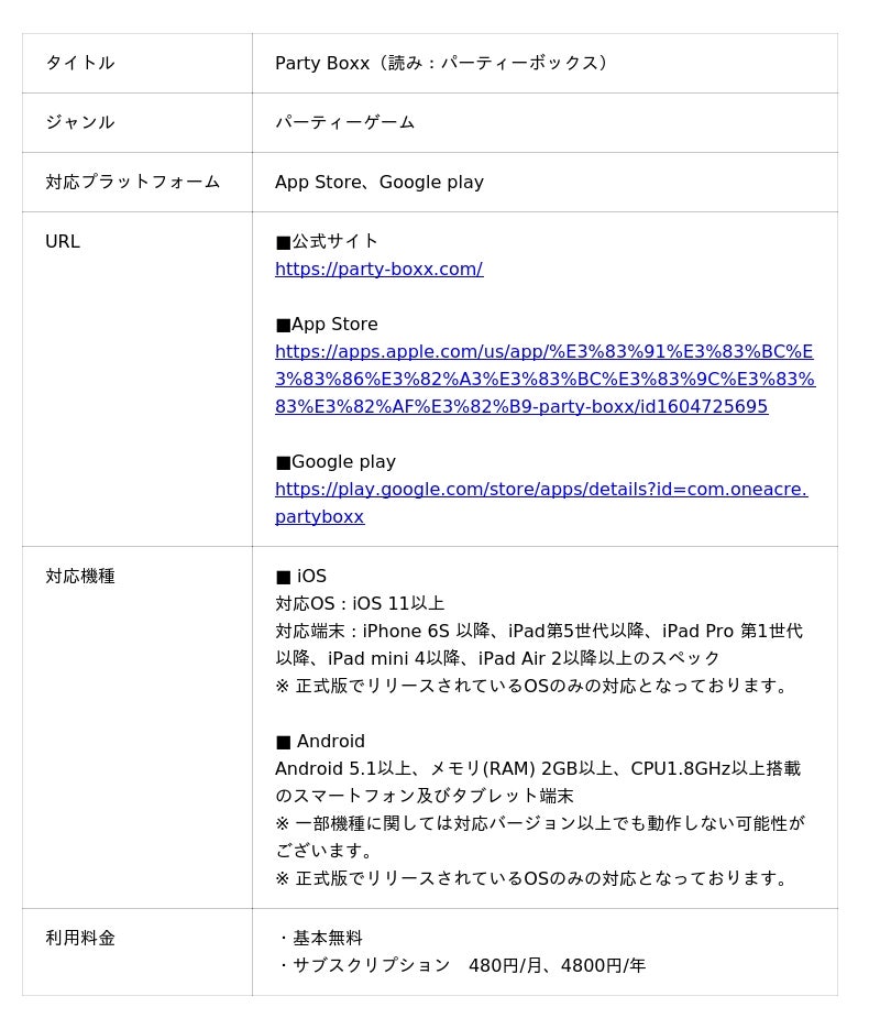 株式会社One Acre(読み:ワンエーカー、本社:東京都中央区、代表取締役:折茂賢成)は、株式会社トリドリ(本社:東京都渋谷区、代表取締役社長CEO:中山貴之、証券コード:9337)と共同開発したパーティーゲーム『Party Boxx』が累計15万ダウンロードを突破したことをお知らせいたします。