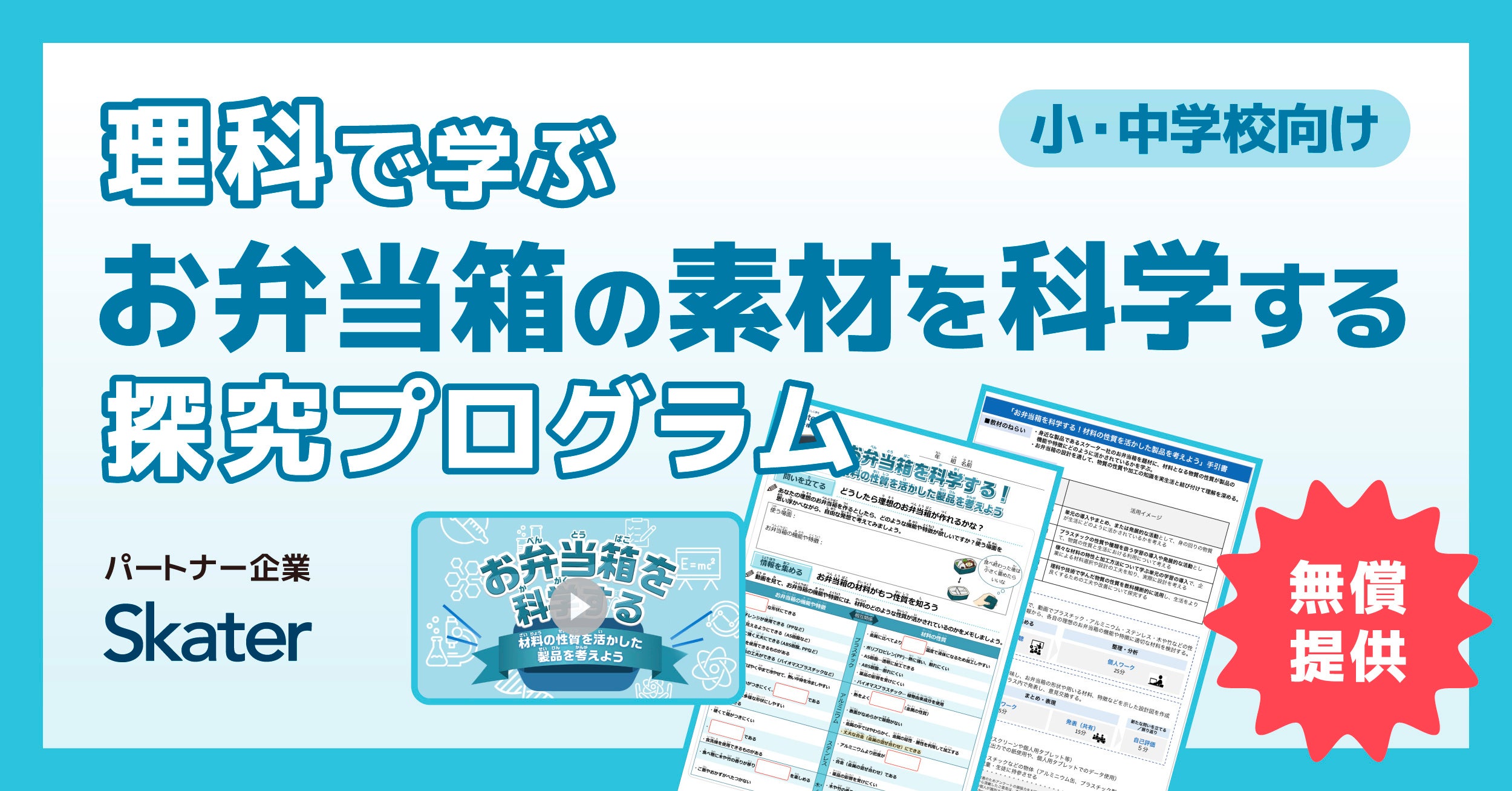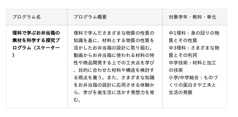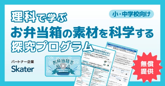 今回はその第八弾として、お弁当箱をはじめ、さまざまな日用品を展開するスケーター株式会社と連携した「理科で学ぶお弁当箱の素材を科学する探究プログラム」を提供いたします。