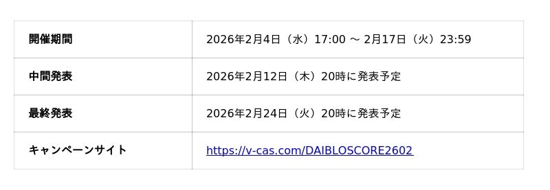 ゲームリリースを記念した本イベントは、2026年2月4日(水)17:00 ~ 2月17日(火)23:59の期間に開催されます。総勢23名のVTuberが参戦し、「配信回数」「ショート動画投稿数」「ゲームダウンロード数」「ゲーム進行度」に応じて加算されるポイントを競いながら、『ダイブロス・コア』の魅力を余すところなくお届けします。緻密な世界観と重厚な戦術バトルが融合した本作をぜひご堪能ください。