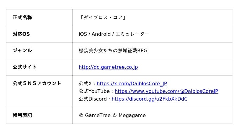 「All for Streamers」をコンセプトに、YouTube・Twitch・Mirrativなど各配信プラットフォームで活動する配信者(VTuber/ストリーマーなど)を支援する株式会社ミラティブのグループ会社、株式会社アイブレイド(本社:東京都豊島区 代表取締役:妻木 泰夫)が運営するVTuberキャスティングサービス「ぶいきゃす」(https://v-cas.com/ )は、GameTreeが提供する『ダイブロス・コア』において、配信イベント「戦場を彩る~ぶいきゃす開幕祭~」を開催することをお知らせいたします。機装美少女たちの禁域征戦RPG『ダイブロス・コア』の配信イベントをぜひお楽しみください!