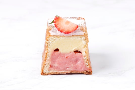あまおう苺のクリームパン(テイクアウト518円/イートイン528円):四角いパンの中に、自家製カスタードクリームと苺クリームの2層構造のクリームを閉じ込めました