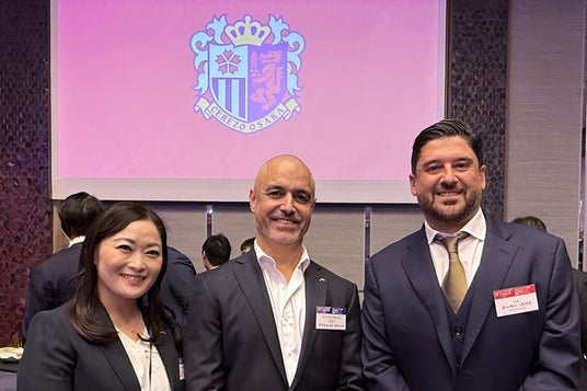 「2026 セレッソ大阪 百年構想リーグ 開幕レセプション」にて、アーサー パパス監督とスイスホテル南海大阪 総支配人 シェーン・エドワーズ / 支配人 竹株枝里