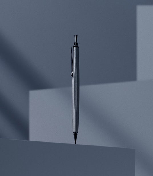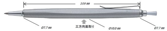 継ぎ目のないボディ(胴軸)は長さ108mm(先金、ノック棒、天冠を除く)。軸径は直径7.7mm→10.0mm→7.7mmと変化する流線形です。軸のほぼ中央を三方向から面取りして三角軸に仕上げました。三角の隆起は両端に向かって丸軸に溶け込みます。三角軸の安定感を宿した解放感ある丸軸。エレガントなカタチが完成しました。