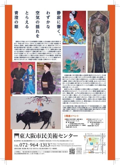 本展では、美しい女性像から文楽を主題とした作品群へ、さらに四季の草花や小さなモチーフへとひろがっていく青澄の画業を紹介します。「静寂に響く、わずかな空気の揺れをとらえる青澄の眼」が、どのように人物へ、舞台へ、そして小さきものへと向けられているのか、また、地域との深い結びつきのもと、平成11年(1999)には東大阪市民美術センター名誉館長に就任し、晩年に至るまで後進の育成と地域文化の振興にも尽力した、青澄の温かいそのまなざしの行方を感じ取っていただけることでしょう。