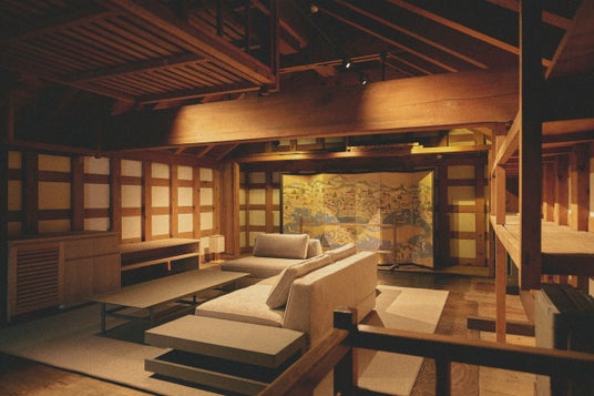 ホテル「旧相馬家 Kazeno Heritage」客室のイメージ 明治期につくられた蔵の建築様式に浸る※開業準備中のため、写真の内装・調度は計画段階のものです(江差屏風を配したリビング)。仕様は変更となる場合があります。