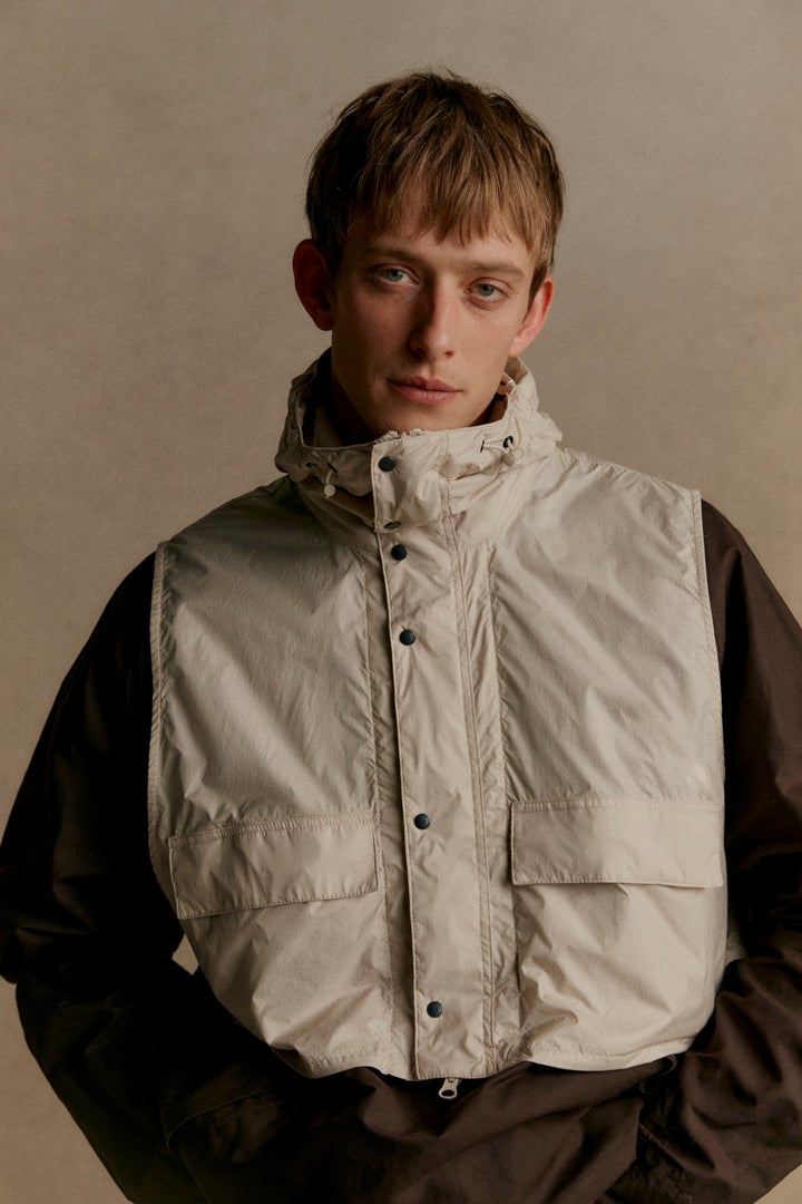 トランスポートをベースに、バブアーのアーカイブモデルであるセーリングジャケットから着想を得た一着。モジュラー構造を採用し、カラーコントラストが目を惹くノースリーブ仕様のオーバーガーメントを組み合わせた2-in-1デザインが特徴。