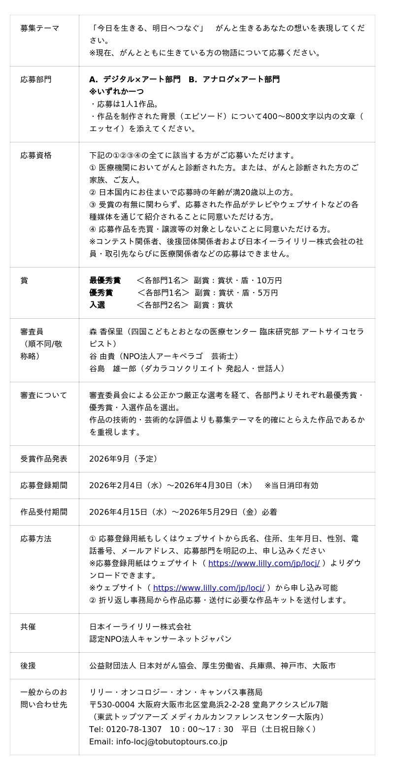 日本イーライリリー株式会社(本社:兵庫県神戸市、代表取締役社長:シモーネ・トムセン、以下、日本イーライリリー)および認定NPO 法人キャンサーネットジャパン(本部:東京都文京区、理事長: 岩瀬 哲、以下、キャンサーネットジャパン)は「ワールドキャンサーデー」である2月4日(水)、がんと診断された方、そのご家族、ご友人を対象にしたデジタル×アート・アナログ×アート コンテスト 「第16回リリー・オンコロジー・オン・キャンバス。『今日を生きる、明日へつなぐ』(以下、リリー・オンコロジー・オン・キャンバス)の応募登録を開始しました。