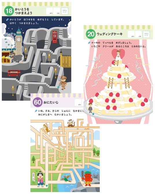 (迷路やしりとりなどのパズル形式も取り入れているので、論理的思考力も育ちます。)