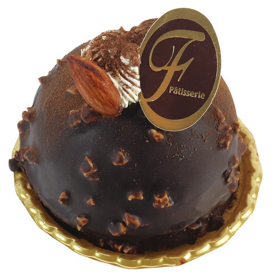 チョコレートムースとピスタチオムースの中にベリーソースをしのばせ、アーモンド入りのチョコレートで包み、上面にはシャンテリークリームとアーモンドを飾りました。