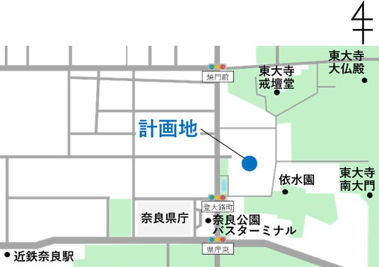 本施設の建設予定地は、古都奈良の中核エリアに位置し、奈良公園に隣接するとともに、かつて西大門が建っていたとされる史跡「東大寺旧境内」の一角にあたります。