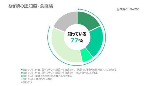 2025年の大阪万博開催に伴い、国内外からの大阪グルメの認知度が上昇し、ねぎ焼も注目グルメとなっています。ねぎ焼の認知度としては77%と高いものの、家庭での食経験は35 %にとどまっています(当社調べ 2025年 N=200)。