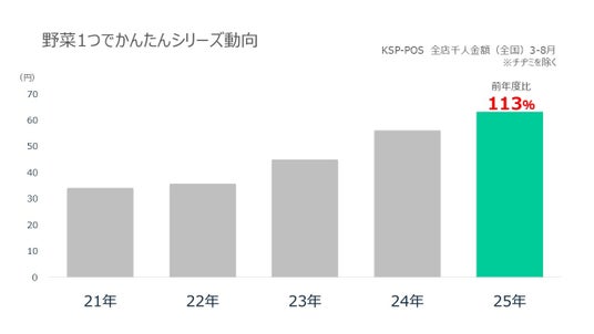 シリーズ動向としては、前年比113%と大きく伸長しており、その背景には「野菜1つですぐに作れる」「野菜がしっかり摂れる」「野菜が主役の大皿料理が完成する」といった簡便性や価値が、今の生活者ニーズに合致していると考えます。