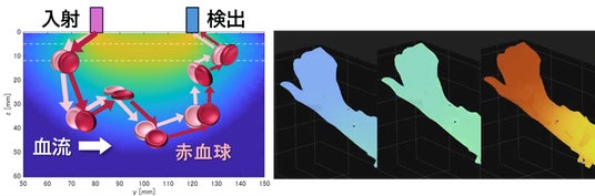 直進性の高い近赤外光を生体内に入射すると、光子は組織中の赤血球によって散乱される(左)。血流が速く赤血球の運動が大きいほど、検出される光強度は時間的にランダムに変動する。この変動特性から、組織血流速度を非侵襲的に計測できる。開発したセンサを用いて前腕の血流変化を計測すると、心拍に同期した血流の脈動や、部位ごとの酸素需要の違いに応じた血流速度分布を可視化できる(右)。