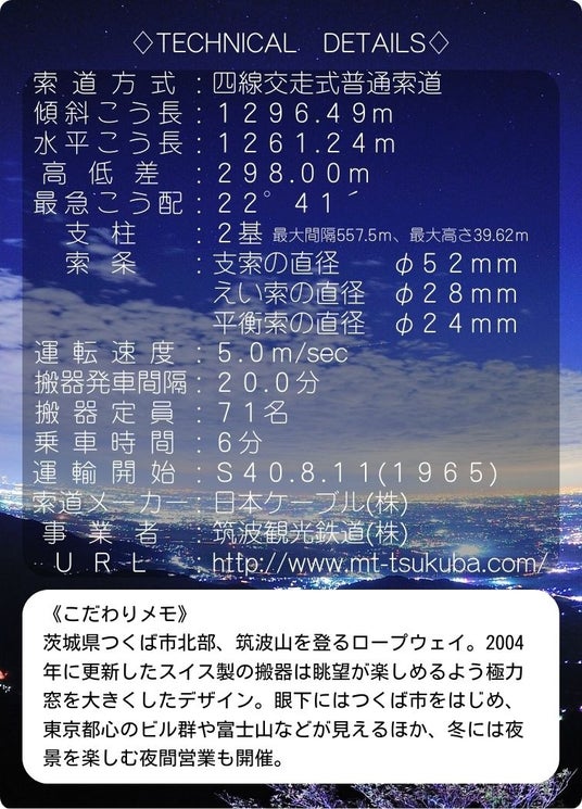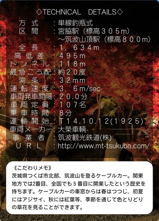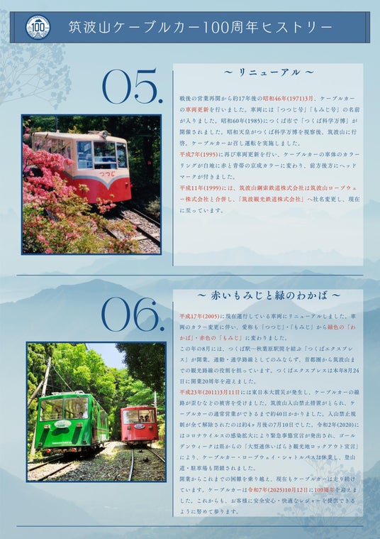 京成グループの筑波観光鉄道(本社:茨城県つくば市、社長:枝村 誠)が運行する筑波山ケーブルカーでは、2025年10月12日(日)より開催している「筑波山ケーブルカー開業100周年記念キャンペーン」の第2弾として「ケーブルカー開業100周年×ロープウェイ開業60周年記念カードセット」の販売と、「ケーブルカー100周年ヒストリーパネル」を設置いたします。