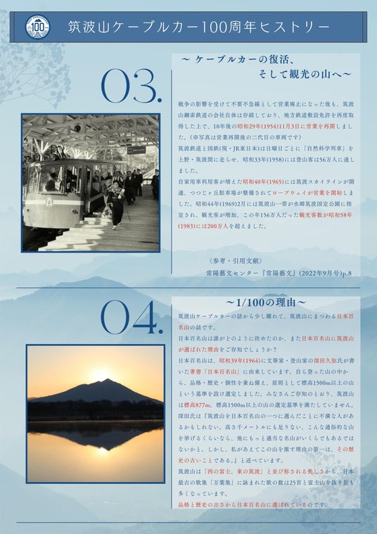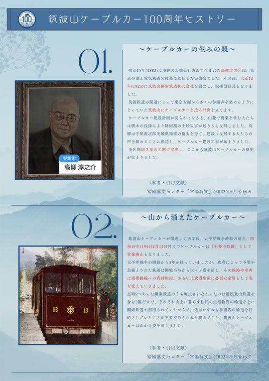 「ケーブルカー100周年ヒストリーパネル」では、1925年の開業当時から現在に至るまでの歩みを、写真や解説とともにご紹介いたします。車両や設備の変遷、時代ごとのエピソードを通じて、筑波山ケーブルカーが歩んできた100年の歴史をご覧いただけます。