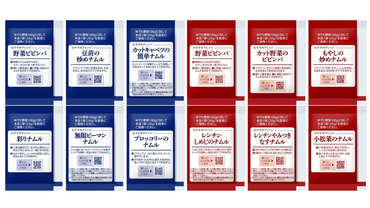 ナムルは副菜のイメージがありますが、ご飯にのせてビビンバにしたり、肉と一緒に炒めて炒め物にしたり等、主食やおかずとして活用できる点が魅力です。そこで、当商品を使って手軽に作れる野菜レシピをより多くの方にお届けしたいと思い、おすすめアレンジレシピのQRコードを個包装の袋に記載し、全11種類をランダムで封入しました。