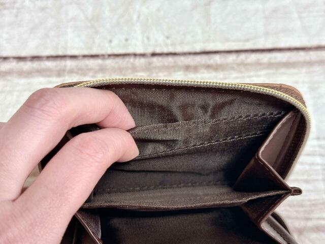 紙幣は3つ折りにすれば収納できるサイズ感。カードポケットには1つにつき最大3枚まで収納でき、合計12枚のカードが入りました。