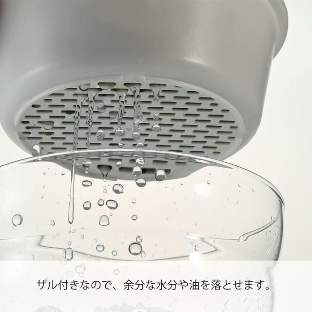 本製品は、耐熱ガラス製の本体と付属のザルを組み合わせて使う調理器具。食材をザルにのせて電子レンジで加熱することで、余分な水分や脂が自然に下へ落ち、ベタつきにくい蒸し料理に仕上がります。