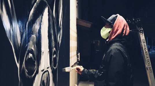 ニューヨークや全国の百貨店、ギャラリーで個展を開催し、日本各地のカフェやインテリアショップでウォールアートを手がけるなど、EIJI TAMURA DOG ARTの作品は街中で広く親しまれています。