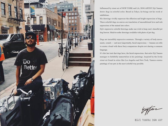 幼い頃から絵を描き始め、グラフィックデザイナーとしてのキャリアを経て、アート活動に専念したEIJI TAMURA DOG ART。彼のドッグアートは、自身の愛犬を描き始めたことからインスピレーションを受け、今では彼の作品の中心となっています。