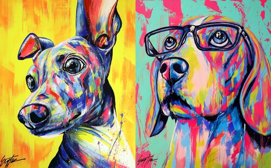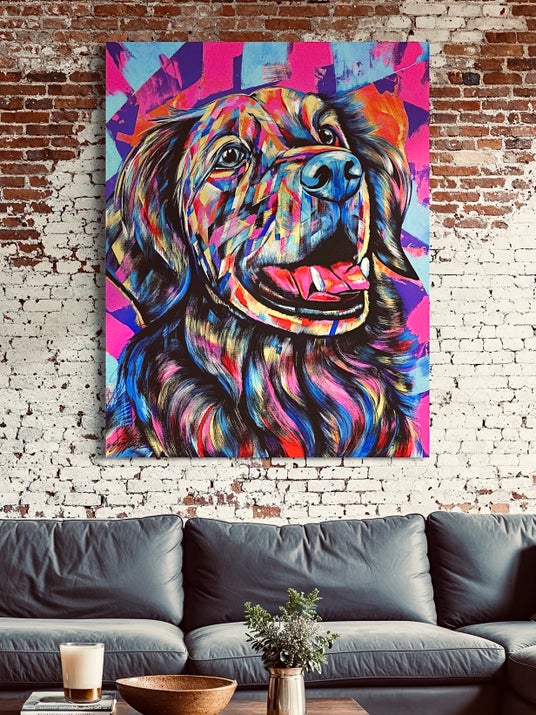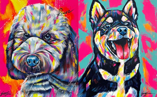 伝統的な肖像画の構造をベースにしながらも、そこに大胆で革新的な表現を加えることで、観る者に強烈な印象を与える。豊かな色彩と力強い筆致によって、表情のわずかなニュアンスまで丁寧に描き込み、それぞれの犬が持つ「魂」と「個性」をキャンバスに刻み込んでいる。