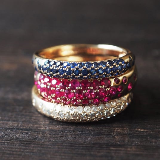 ルビーとサファイアは、それぞれの照りと発色をまっすぐに感じていただけるよう一色で構成。深紅はより深く、深藍はより澄んだ印象へと際立ちます。