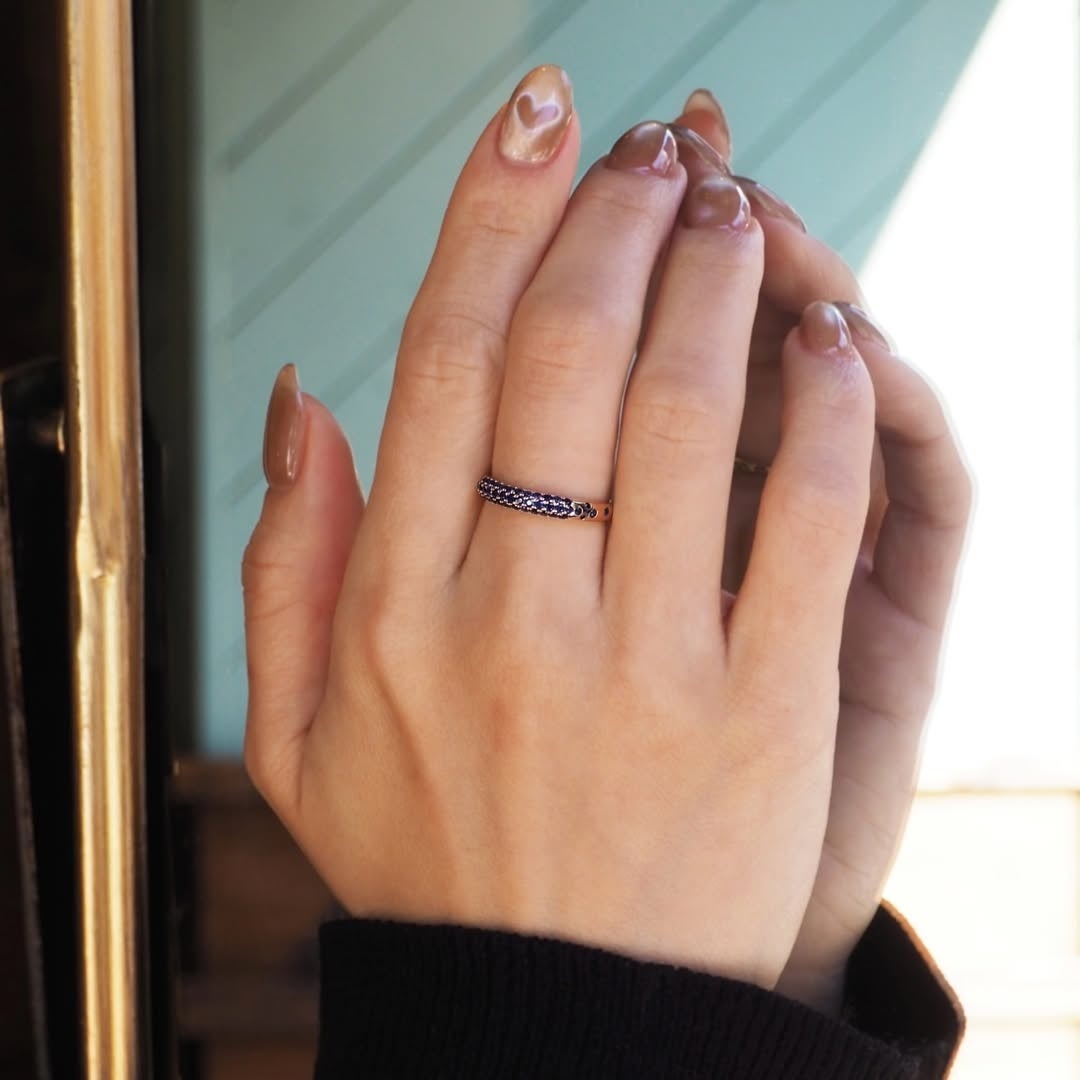 ■ Mira ― 宝石の色と光を面で受け止めるパヴェリング「Mira(ミラ)」=イタリア語で”羨望の的”。ふっくらとした地金の曲線に沿って、縁まで隙間なく宝石を敷き詰めたパヴェリングです。