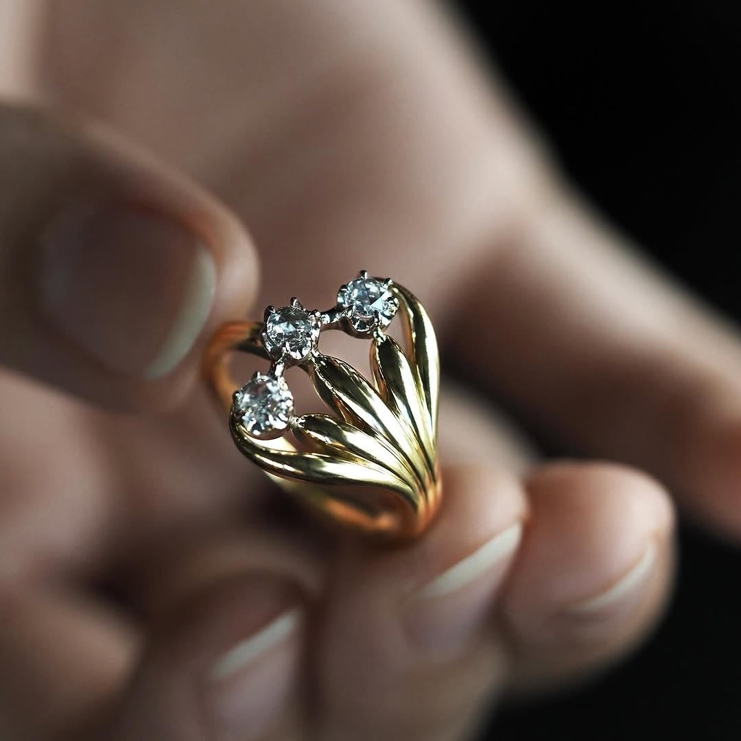希少な「8ファセットカット(シングルカット)」のダイヤモンドは、一般的な58面体のラウンドブリリアントカットに対し17面体で構成され、1面ごとの面積が大きいことが特徴です。細かな煌めきではなく、面で光を返すことで、指先のわずかな動きにも呼応して大きく、瞬くような輝きを放ちます。一般にはほとんど流通していないため、パーセル ジュエリーが独自に研磨いたしました。