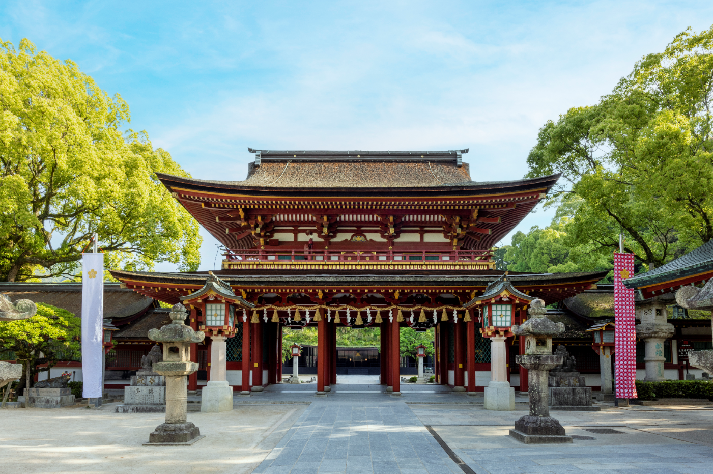 必勝祈願でおなじみ、日本三大八幡宮のひとつである「筥崎宮」を巡ります。創建は平安時代とされ、厄除けや勝運のご利益があります。国の重要文化財である楼門をくぐり、美しい朱塗りの本殿・拝殿に参拝いただけます。
