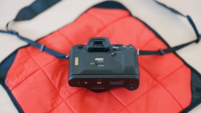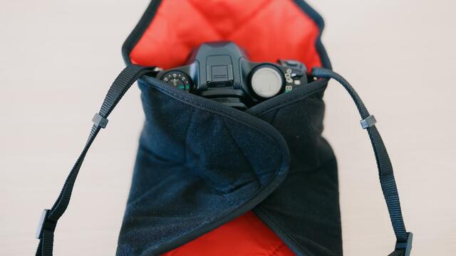 撮らないときはカメラをやさしく包み、そのままストラップで首や肩から下げておけます。